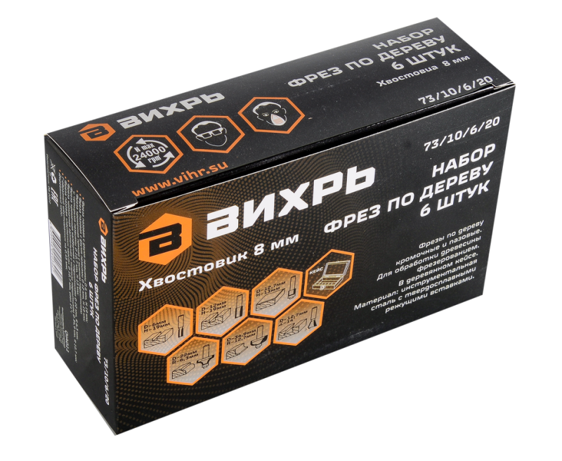 Набор фрез по дереву Вихрь 6шт (хвостовик 8мм), кейс, 73/10/6/20