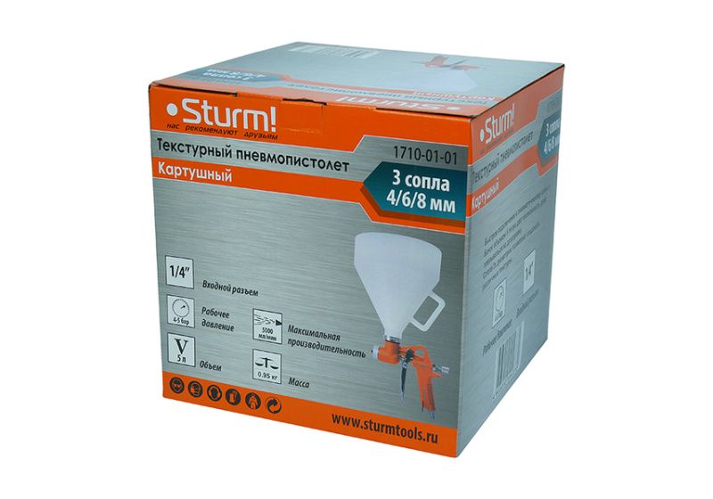 Краскопульт пневматический картушный для штукатурки, бак 5 л, сопла 4, 6, 8 мм Sturm, 1710-01-01