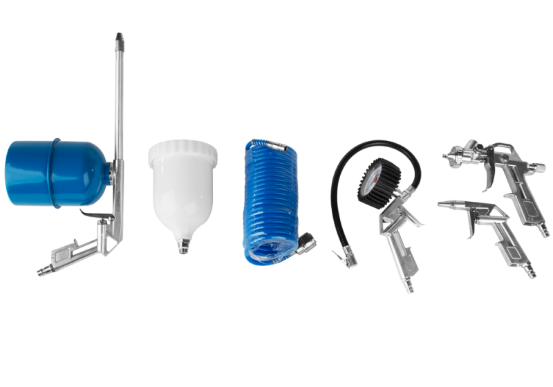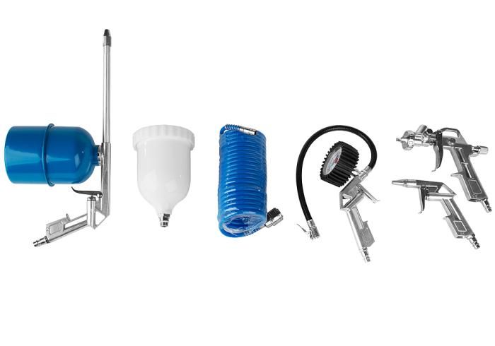 | Назначение | Набор пневмоинструмента для воздушных компрессоров: • Пистолет для накачки колес с манометром • Краскопульт с верхним баком • Продувочный пистолет • Промывочный пистолет • Спиральный шланг 5м |