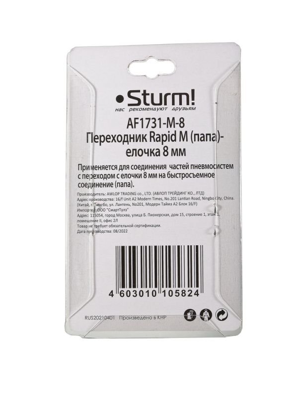 Пневмофитинг елочка 8 мм на рапид (папа) Sturm, AF1731-M-8