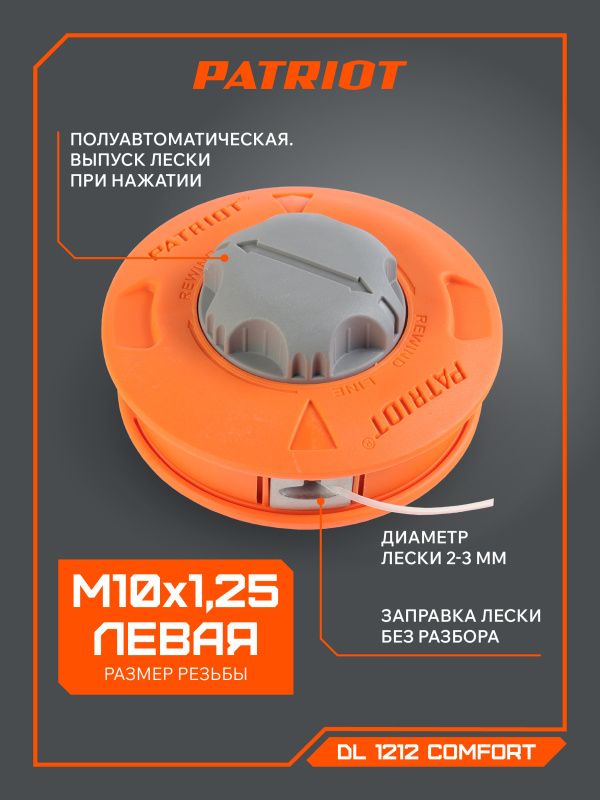 Катушка Patriot DL-1212 Comfort подходит ко всем бензотриммерам с прямой штангой. Применяется для скашивания травы любых видов. Крепление на оси М10х1,25 LH. Диаметр лески 2,0-3,0 мм. Леска подается автоматически - для этого достаточно слегка ударить катушку о землю. Заправка лески осуществляется без снятия крышки с катушки, достаточно вставить в отверстия катушки леску и намотать ее с помощью кнопки-фиксатора.