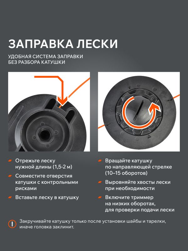 Заправка лески осуществляется без снятия крышки с катушки, достаточно вставить в отверстия катушки леску и намотать ее с помощью кнопки-фиксатора.