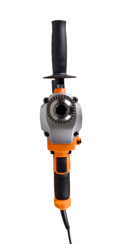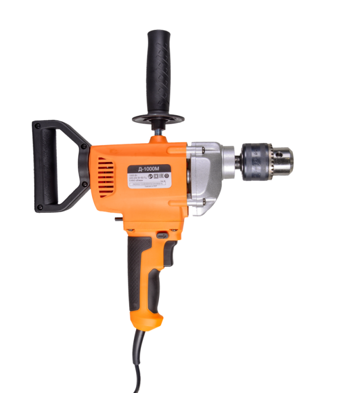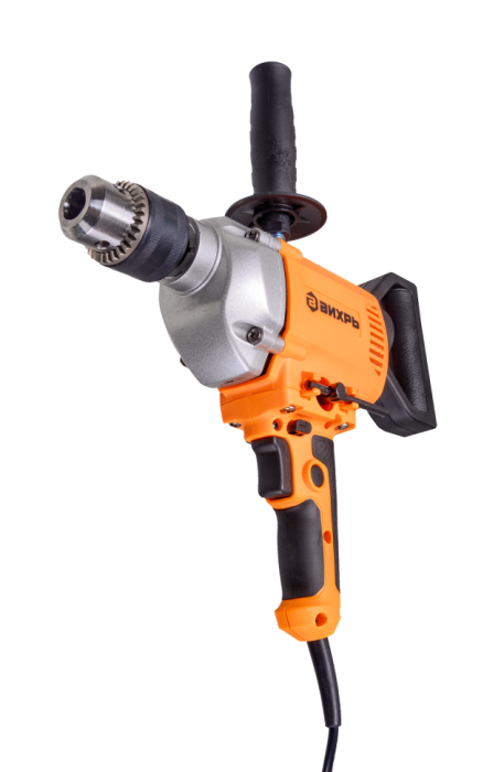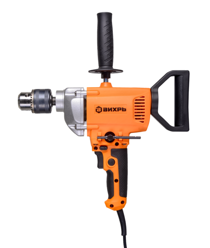 Дрель-миксер Д-1000М Вихрь - электрический инструмент двойного назначения, предназначенный для сверления отверстий в различных конструкционных материалах (дерево, сталь, кирпич, легкий бетон и т. д) (при установке соответствующих сверл), и перемешивание лакокрасочных материалов (при установке соответствующей насадки). Данное устройство сможет одновременно заменить два электроинструмента, что положительно скажется на бюджете покупателя.Особенности Д-1000М: 1. Дополнительная рукоятка для удобной работы в двух режимах (дрель и миксер). 2. Регулировка скорости вращения шпинделя нажатием на кнопку включения. 3. Функция реверса. 4. Наличие фиксатора кнопки включения позволяет зафиксировать ее в рабочем положении при длительной работе. 5. Возможность вращения задней рукоятки на 360° позволяет выбрать удобный хват. Преимущества Д-1000М: 1. Многоцелевая дрель-миксер идеально подходит для сверления отверстий большого диаметра и размешивания различных растворов, краски и бетона 2. Высокий крутящий момент позволяет сверлить глубокие отверстия большого диаметра, например, сверлом Левиса и размешивать различные ЛКМ и даже бетон 3. Электронная регулировка частоты вращения позволяет начать размешивание без разбрызгивания и производить точное сверление отверстий 4. Реверсирование вращения помогает как извлекать сверла из глубоких отверстий, так и менять направление перемешивания простым переключением рычажка 5. Металлический корпус редуктора обеспечивает повышенную прочность узла и лучшее охлаждение редуктора в условиях повышенных нагрузок 6. Усиленная основная рукоятка с удобным держателем ключа патрона 7. Ключевой патрон с максимальным диаметром 16 мм под большинство сверл и хвостовиков насадок 8. Фиксатор выключателя в нажатом положении для длительных работ 9. Возможность быстрой замены щеток, что позволяет практически не прерывать рабочий процесс 10. Прорезиненный кабель, выдерживающий пониженные температуры, «не дубеющий» на морозе.