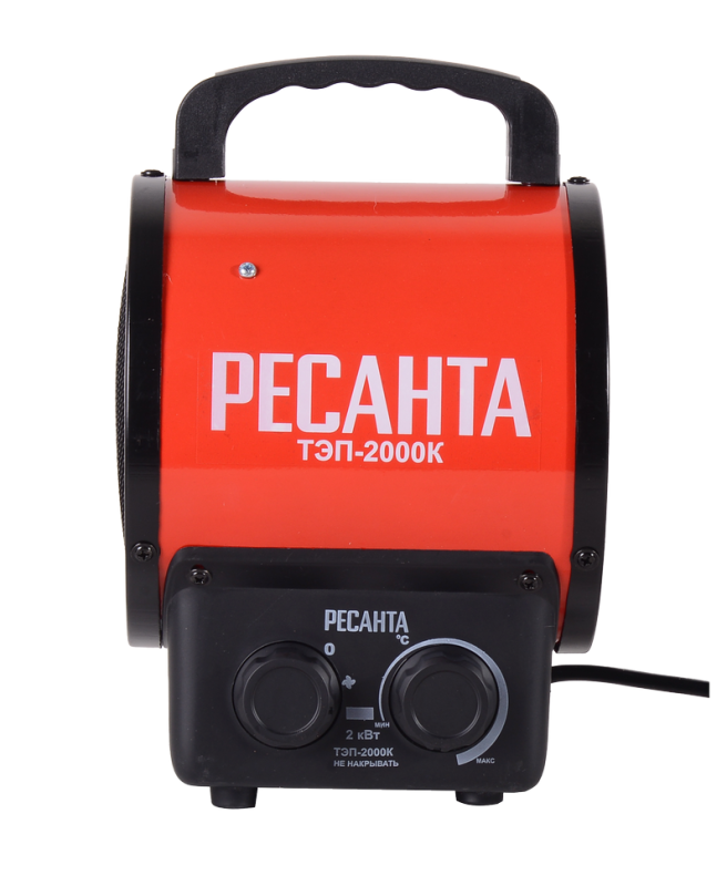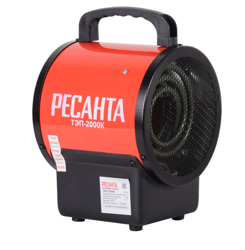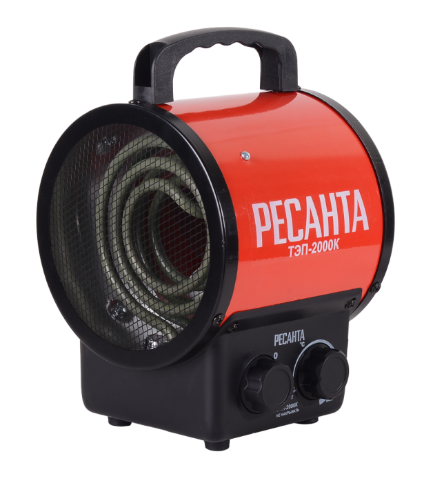 Тепловая электрическая пушка РЕСАНТА ТЭП-2000К предназначена для вентиляции и обогрева жилых и производственных помещений, складов, гаражей, а также для обогрева и сушки в строительстве. Прибор относится к тепловым пушкам круглого типа. Нагревательный элемент - трубчатый. Данная модель рассчитана на питание от электросети переменного тока частотой 50 Гц, номинальным напряжением 220-230В (однофазная). Устанавливается на полу.Обогреватель оснащен регулировкой режимов работы (мощности):