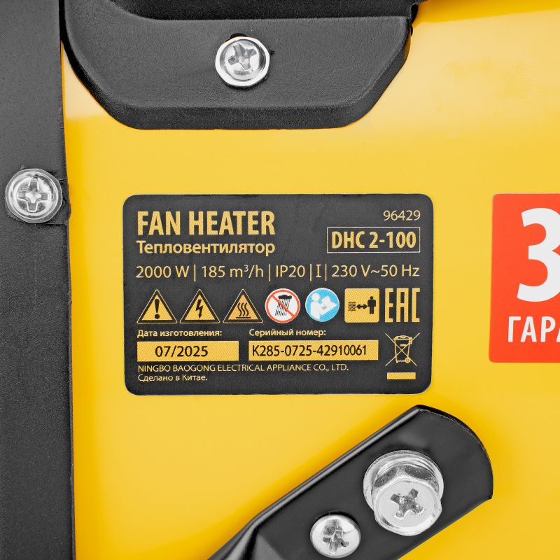 Электрическая тепловая пушка Denzel DHC 2-100 обладает следующими характеристиками: