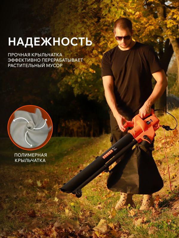 Воздуходувка Patriot PT BV2000E, 755302451 используется для очистки приусадебных территорий от различного рода мусора – опавших листьев, бумаг, веток и других мелкогабаритных предметов. Работает устройство за счет электрического двигателя, мощность которого – 2 кВт. Он способен генерировать поток воздуха силой в 75м/сек. Этого достаточно для очистки приусадебных участков с неровным ландшафтом. Инструмент имеет небольшие габариты и вес, а при работе не производит много шума. Одной из особенностей данного агрегата является то, что он совмещает три прибора в одном – это и воздуходувка и садовый пылесос и измельчитель одновременно. Внутри инструмента расположены острые лезвия, которые быстро превращают различный органический мусор в удобрения для почвы. Комфорт при работе достигается благодаря наличию транспортировочных колесиков возле сопла – они забирают себе часть нагрузки, облегчая работу оператора.