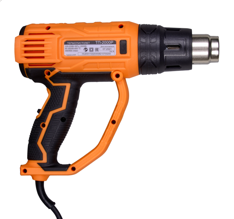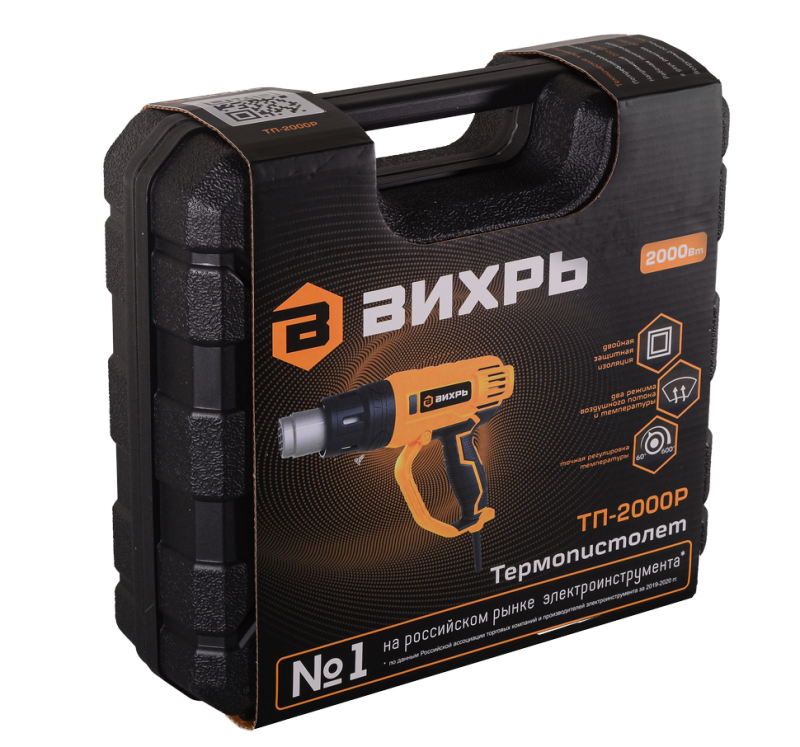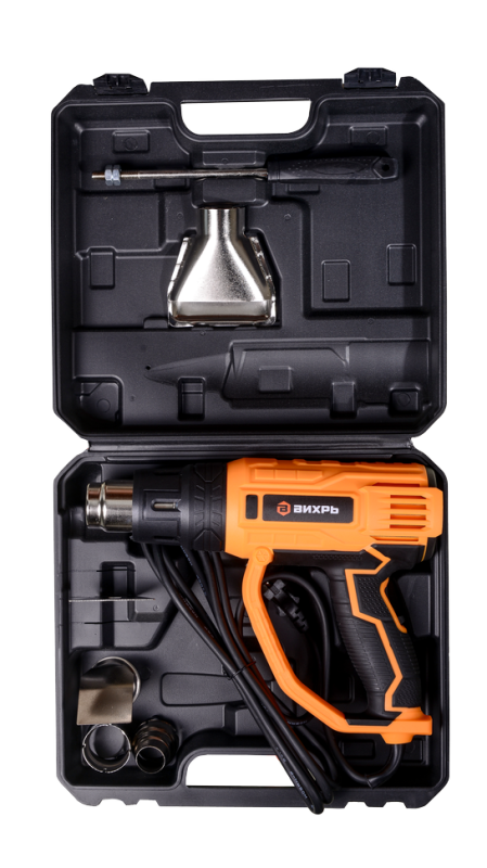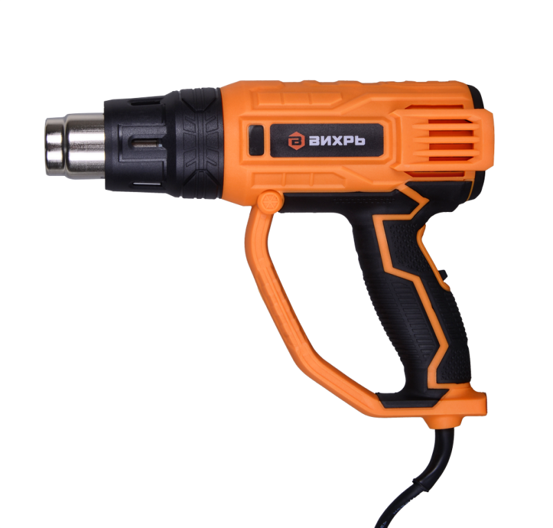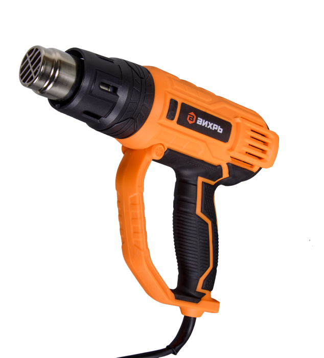 Термопистолет (фен промышленный) ВИХРЬ ТП-2000Р – ручной электроинструмент для обработки горячим воздухом поверхностей и материалов, для удаления красок, формования и сварки пластмассы, нагревания термоусадочных труб; инструмент также подходит для пайки и лужения, размягчения клеевых соединений (швов), а также размораживания водопроводных труб.