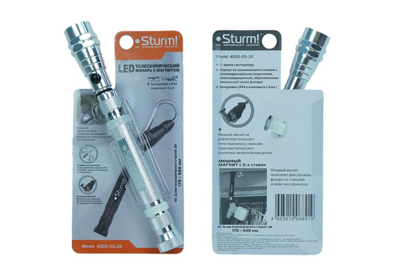 | Дополнительные характеристики | Гибкий телескопический стержень (175-530 мм); 2 мощных магнита; 3 светодиода силой 18000 МСD; Эргономичная рукоятка; Корпус из алюминиевого сплава; Крепление- прищепка на ремень; Питание: 4 батарейки LR44 - в комплекте; |