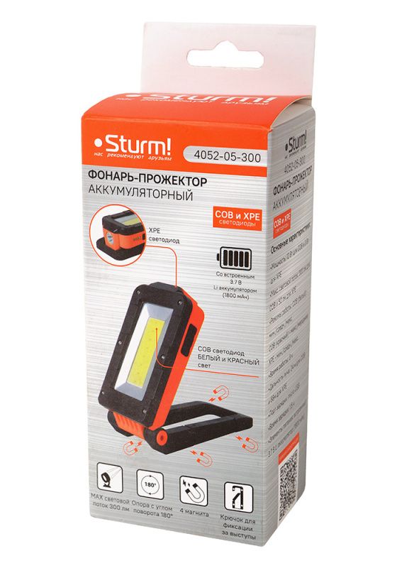 Фонарь-прожектор 300лм, аккумуляторный, COB+XPE светодиоды, 4 магнита, Sturm, 4052-05-300