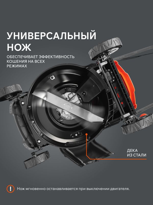 Высокая производительность. Мощный двигатель и продуманная конструкция обеспечивают быстрое и эффективное скашивание травы.