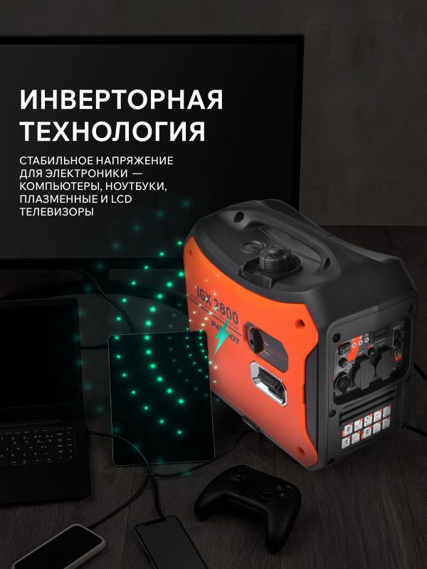 Благодаря инверторной технологии, генератор Patriot iGX-2800 обеспечивает стабильное и чистое электропитание. Это особенно важно для электроники и чувствительных устройств, таких как компьютеры, телевизоры, холодильники и другие бытовые приборы. Вы можете быть уверены, что ваша техника будет работать без сбоев и поломок.