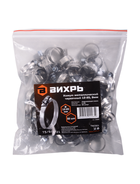 Хомуты металлические червячные Вихрь 12-20, 9мм, 50 шт., 73/9/1/21