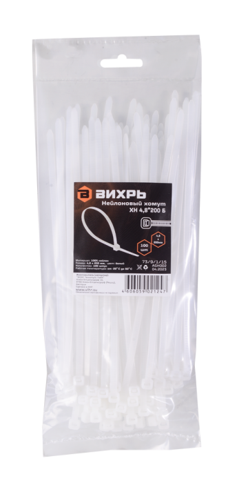Хомуты нейлоновые (стяжки) белые 100 шт. Вихрь 4,8*200 Б, 73/9/1/15