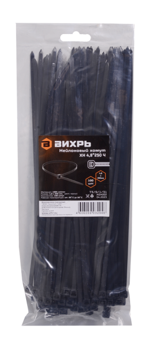Хомуты нейлоновые (стяжки) черные 100 шт. Вихрь 4,8*250 Ч, 73/9/1/31