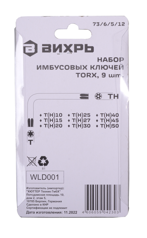 Набор ключей имбусовых Вихрь Torx , 9 шт, T10-T50, 73/6/5/12