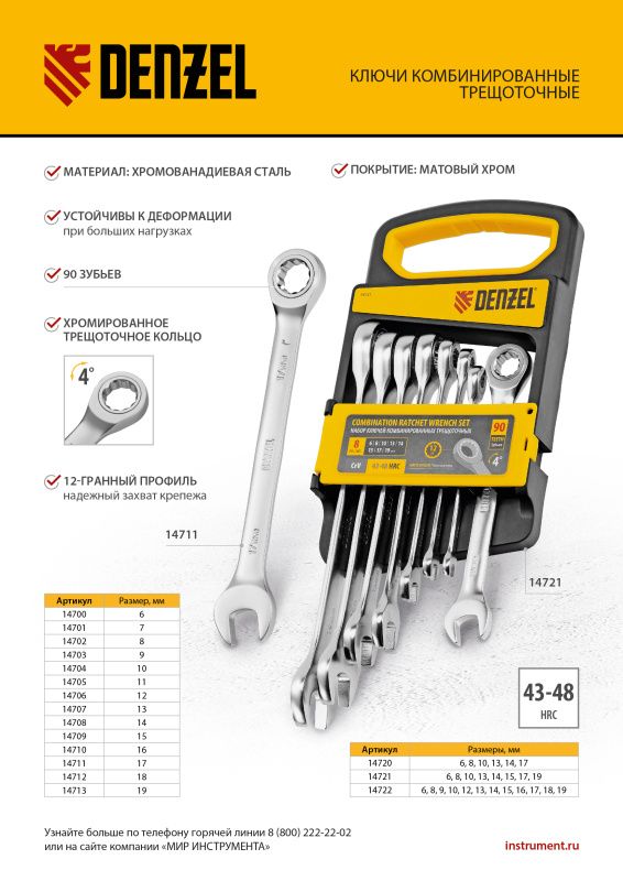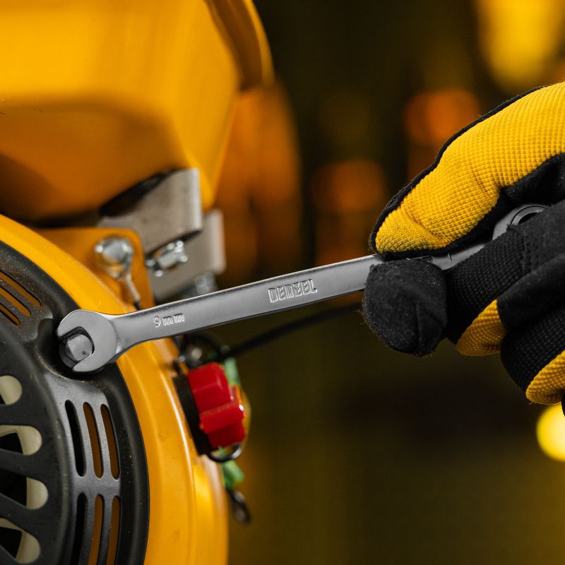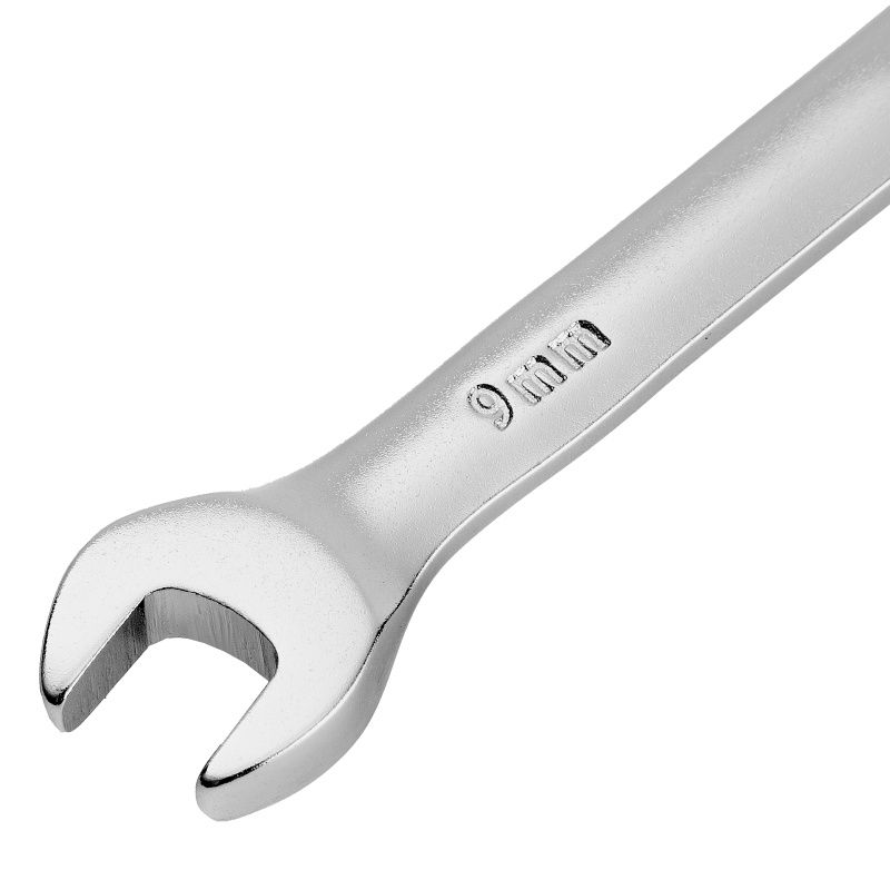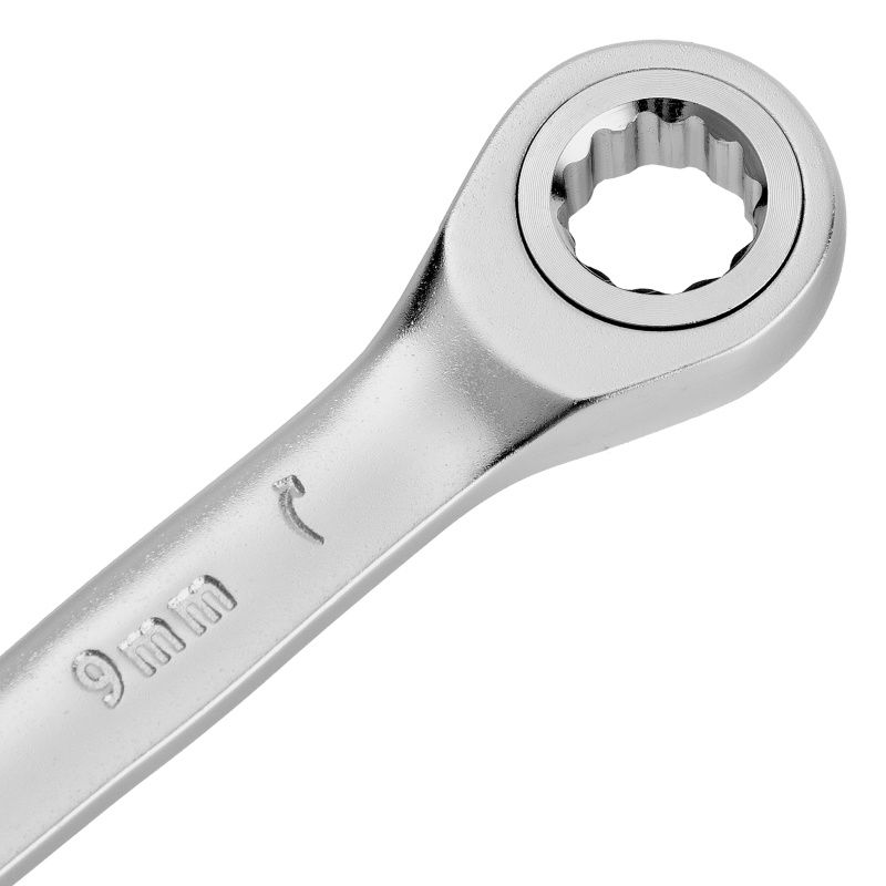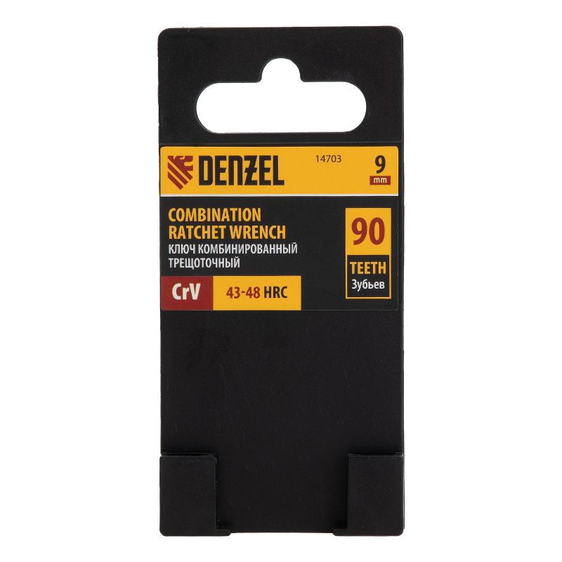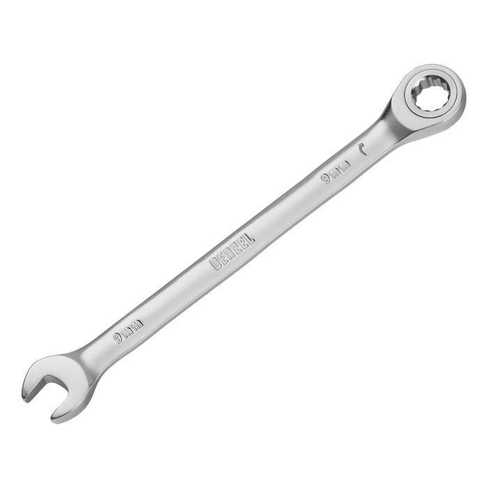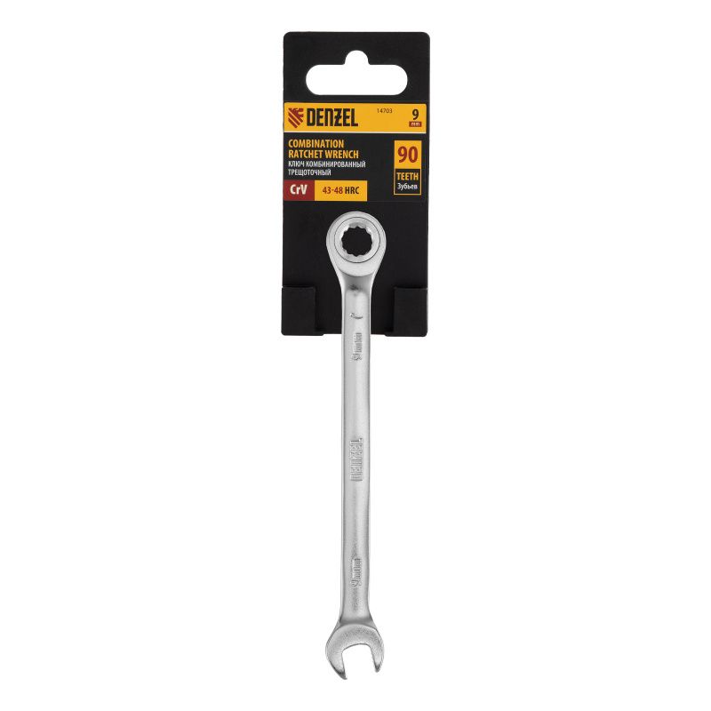 Ключ комбинированный трещоточный, 9 мм, CrV, матовый хром Denzel, 14703