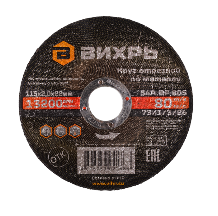 Круг отрезной по металлу ВИХРЬ 115х2,0х22 мм, 73/1/3/26