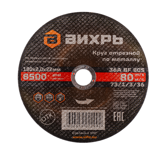 Круг отрезной по металлу ВИХРЬ 180х2,0х22 мм, 73/1/3/36
