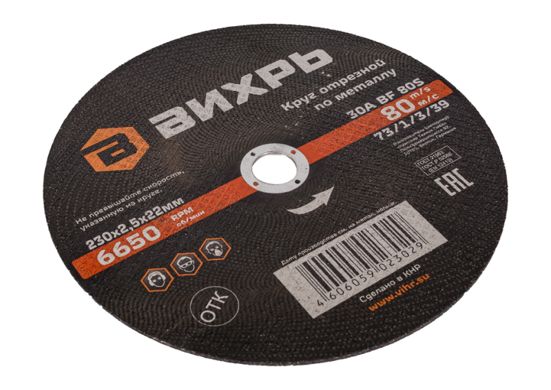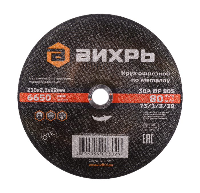 Круг отрезной по металлу ВИХРЬ 230х2,5х22 мм, 73/1/3/39