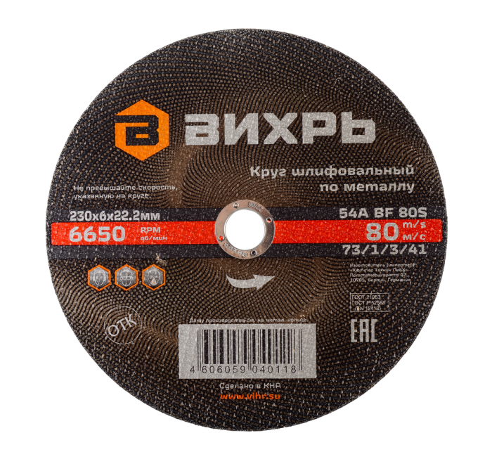 Круг шлифовальный по металлу Вихрь 230х6х22,2 мм для предварительной и финишной обработки изделий из разных материалов.