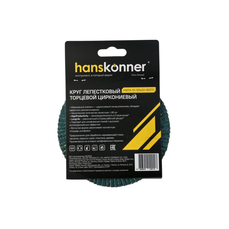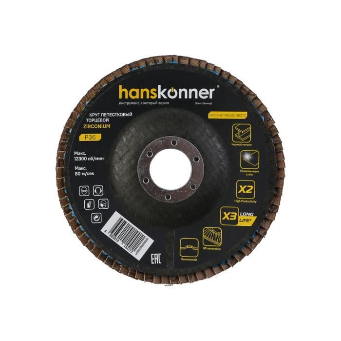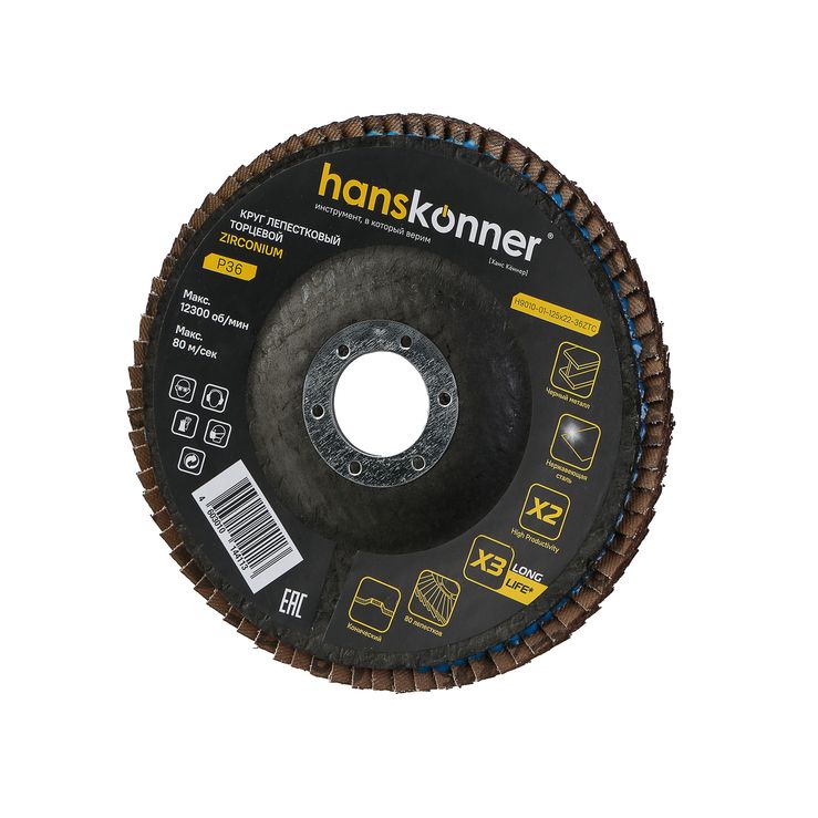 Круг зачистной лепестковый ЦИРКОНИЕВЫЙ, конический 125х22, зерно 36, Hanskonner, H9010-01-125x22-36ZTC