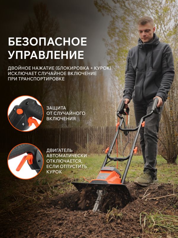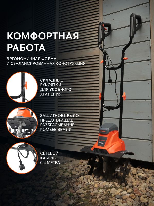 Культиватор оснащен мощным электродвигателем мощностью 1000 Вт, что позволяет ему легко справляться с любыми видами почвы. Благодаря своей компактности и легкости, этот культиватор легко маневрирует даже в труднодоступных местах.