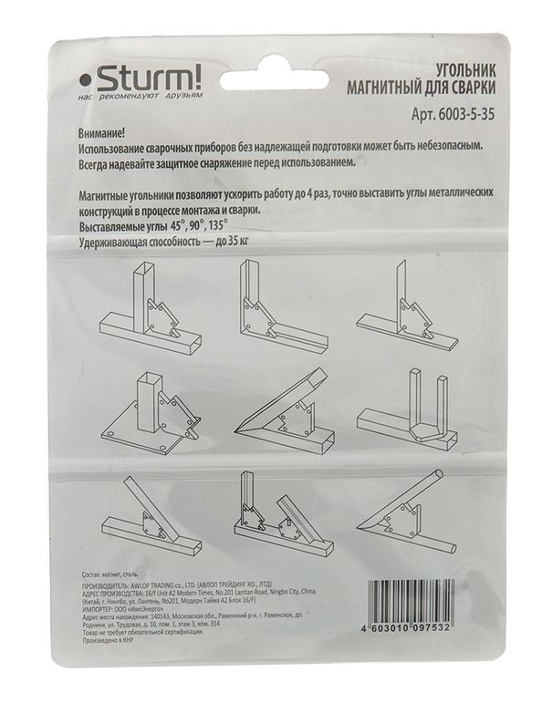 Магнитный угольник Sturm! 6003-5-35 для сварки используется при установки и фиксации деталей под заданным углом во время сварочных, монтажных работ. Заменяет струбцины и зажимы и позволяет обходиться без напарника.