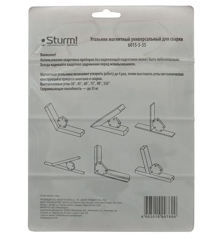 | Назначение | Магнитный угольник Sturm! 6015-5-35 для сварки используется при установки и фиксации деталей под заданным углом во время сварочных, монтажных работ. Заменяет струбцины и зажимы и позволяет обходиться без напарника. |