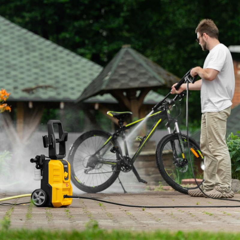 | Комплектация* | мойка высокого давления, кронштейн для шланга, шланг высокого давления, пистолет, удлинитель пистолета с регулируемым соплом, пеногенератор с бачком для моющего средства, входной штуцер с фильтром, быстросъемный коннектор шланга, кронштейн-держатель пистолета, кронштей сетевого кабеля, игла для прочистки сопла, комплект крепежа, инструкция с гарантийным талоном |