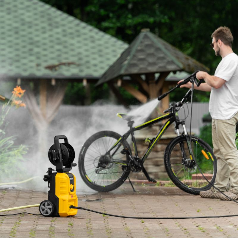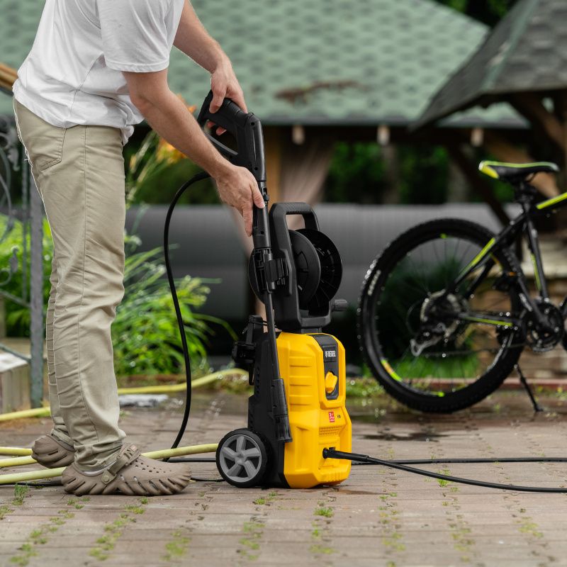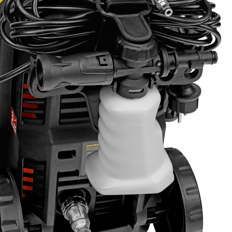 | Комплектация* | мойка высокого давления, барабан для шланга, шланг высокого давления, пистолет, удлинитель пистолета с регулируемым соплом, пеногенератор с бачком для моющего средства, входной штуцер с фильтром, быстросъемный коннектор шланга, кронштейн-держатель пистолета, кронштей сетевого кабеля, игла для прочистки сопла, комплект крепежа, инструкция с гарантийным талоном |