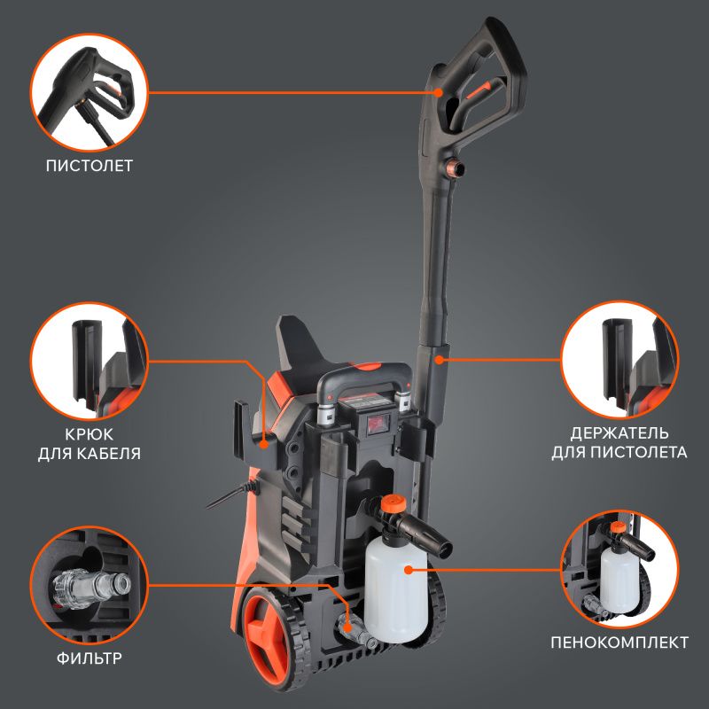 | Комплектация* | Моющий аппарат; Шланг; Пистолет; Пенокомплект; Коннектор для шланга; Фильтр; Инструкция по эксплуатации |