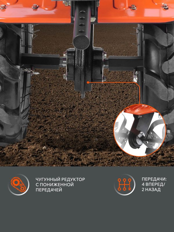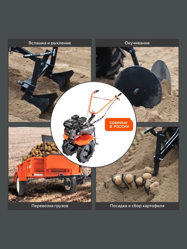 Данная моднль оснащена различными рабочими органами, которые позволяют выполнять разнообразные задачи. На мотоблок можно установить плуг, окучник, картофелекопатель, прицеп, косилку и другие полезные приспособления. Благодаря этому вы сможете использовать мотоблок для различных работ на вашем участке, сэкономив время и силы.