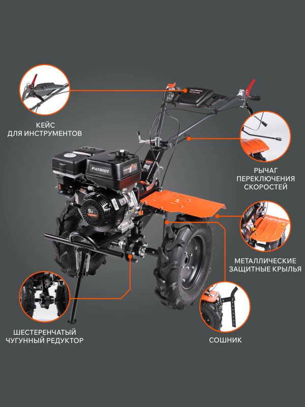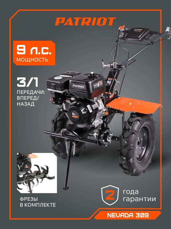 | Дополнительные характеристики | Мотоблок бензиновый PATRIOT Nevada 309; 9,0 л,с;коробка передач: 3 вперед+ 1 назад |