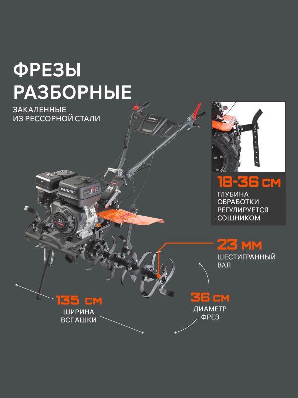 Удобная регулировка глубины обработки позволяет выбрать оптимальный режим работы в зависимости от типа почвы и задачи. Вы сможете легко настроить мотоблок Patriot Nevada 309 под ваши индивидуальные потребности и получить идеальный результат.