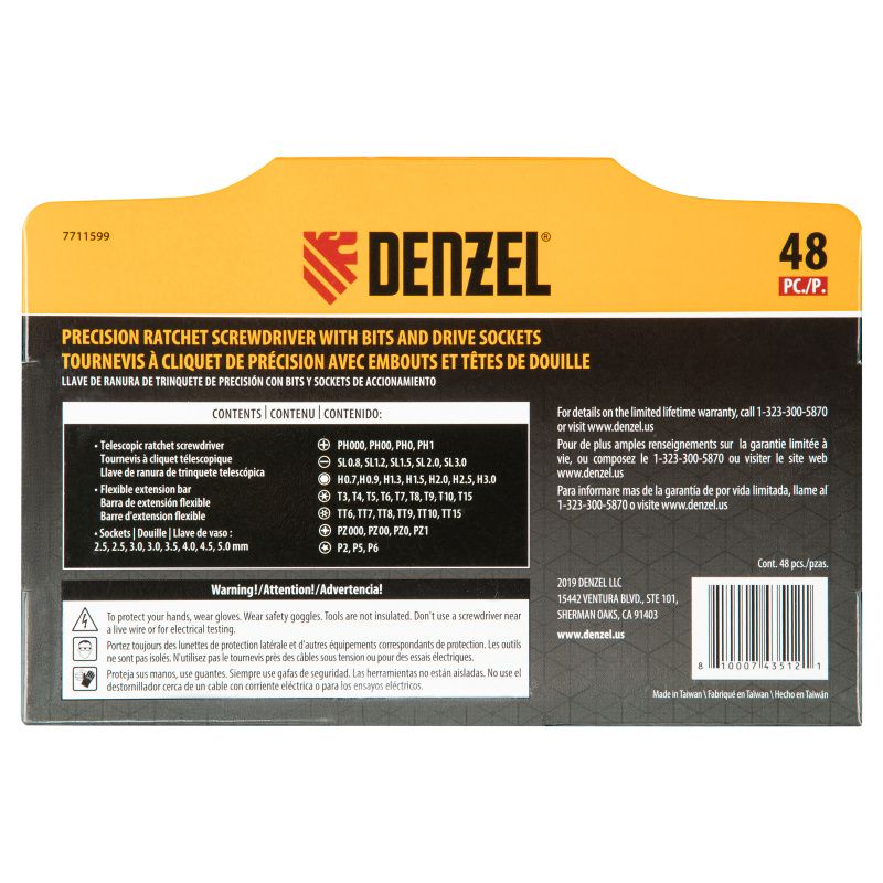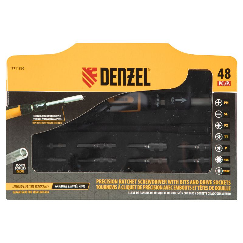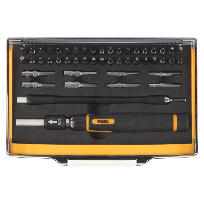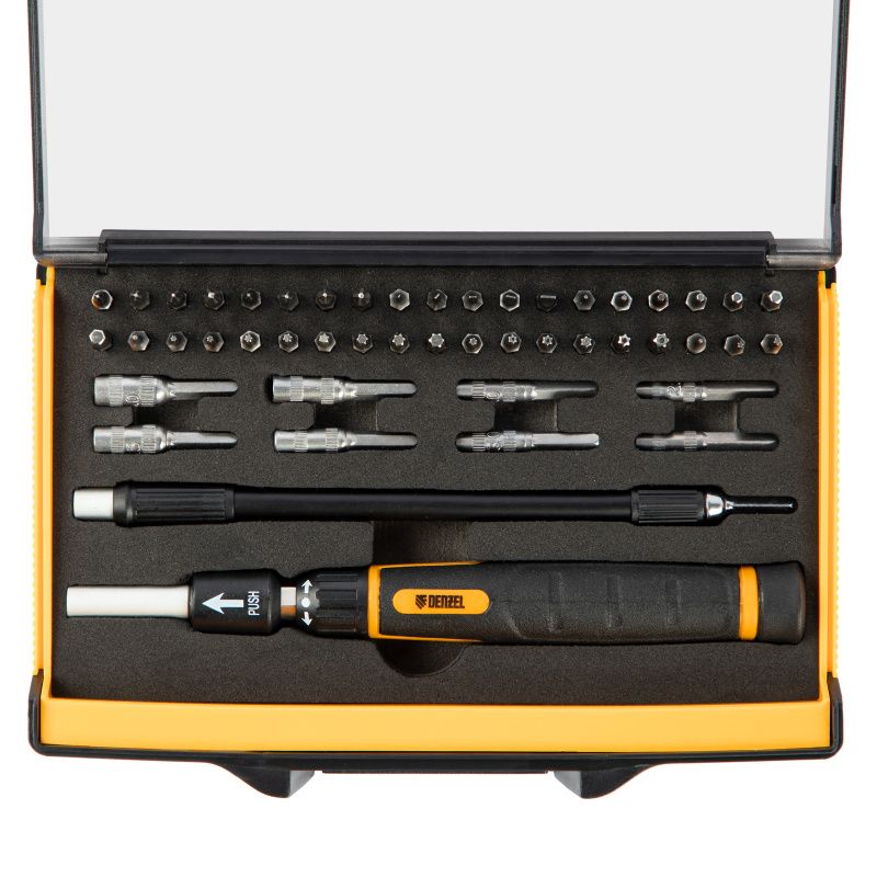 Отвертка с набором бит и торцевых головок для точных работ, гибкий привод, 48 шт, CrMo Denzel, 7711599