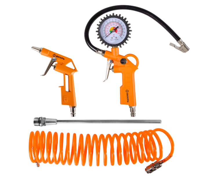 | Комплектация* | Пистолет для продувки, Пистолет для накачки шин, Спиральный шланг, Насадка удлинитель пистолета для продувки |