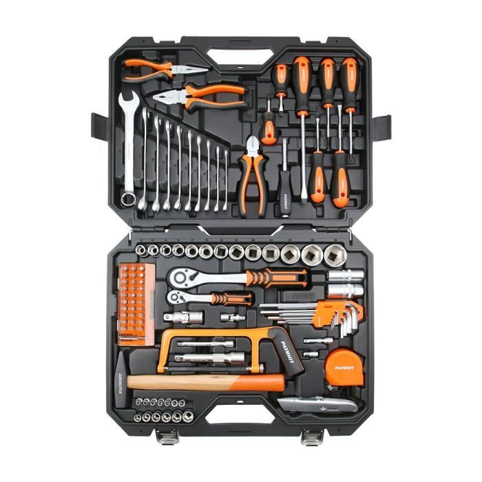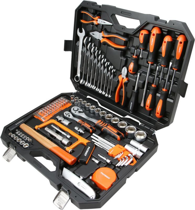 | Комплектация* | Головки торцевые шестигранные 1/4:13шт.; Рукоятка-переходник для вставок-бит 1/4; Соединитель 1/4; Шарнир карданный 1/4; Удлинители 1/4:2шт.; Головки торцевые шестигранные 1/2:13шт.; Удлинитель 1/2; Головки свечные 1/2:2шт.; Шарнир карданный 1/2; Набор бит в магнитном кейсе:31шт.; Кусачки; Пассатижи; Тонкогубцы; Отвертка:7шт.; Рулетка 5м; Молоток слесарный; Набор шестигранных ключей с держателем:9шт.; Комбинированный ключ:10шт.; Ножовка; Нож; Рукоятка трещоточная 1/2, 72 зубца; Рукоятка трещоточная 1/4, 72 зубца; Кейс пластиковый |