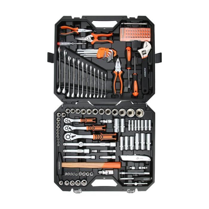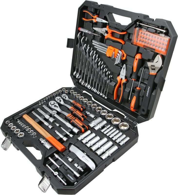 | Комплектация* | Головки шестигранные торцевые 1/4:9шт.; Головки шестигранные торцевые 1/4:7шт.; Головки шестигранные торцевые 1/4:5шт.; Соединитель-переходник 1/4 DR×1/4 HEX; Адаптер-переходник 1/2,1/4,3/8; Шарнир карданный 1/2,1/4,3/8; Удлинитель 1/4; Рукоятка-переходник для вставок-бит 1/4; Гибкий удлинитель 1/4; Рукоятка трещоточная 1/4, 72 зубца; Головки торцевые шестигранные 3/8:7шт.; Головки шестигранные торцевые 3/8:3шт.; Головки шестигранные торцевые 3/8:6шт.; Рукоятка трещоточная 3/8, 72 зубца; Удлинитель 3/8:2шт.; Головки шестигранные торцевые 1/2:7шт.; Головки шестигранные торцевые 1/2:3шт.; Головки шестигранные торцевые 1/2:3шт.; Рукоятка трещоточная 1/2, 72 зубца; Головки свечные 1/2:2шт.; Удлинитель 1/2:2шт.; Набор шестигранных ключей с держателем:9шт.; Комбинированный ключ:12шт.; Пассатижи; Тонкогубцы; Ключ разводной; Молоток слесарный; Строительный нож; Отвертка:2шт.; Тестер; Набор бит в магнитном держателе:31шт.; Ножницы; Удлинитель телескопический; Кейс пластиковый |