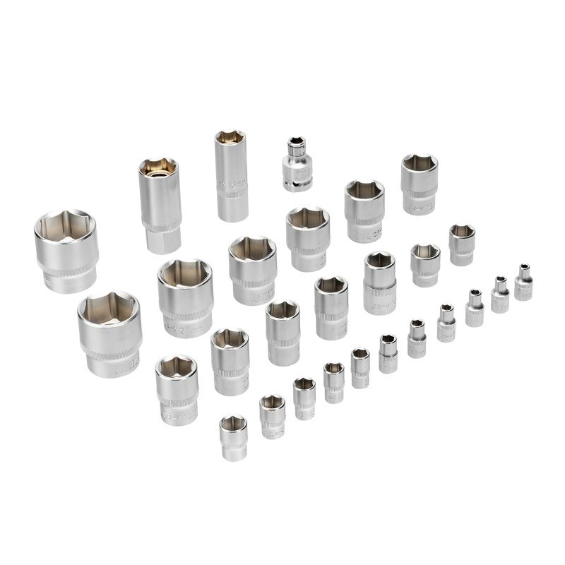 ключ-трещотка 1/2", 1/4" - 2 штвороток т-образный 1/4": 115 мм - 1 штудлинители 1/2": 125, 250 мм - 2 штудлинители 1/4": 50, 100 мм - 2 штудлинитель гибкий 1/4": 145 мм - 1 шт3-сторонний адаптер 3/8"-1/2" - 1 штпереходник для бит 1/4" - 1 шткардан 1/2", 1/4" - 2 штотвертка-держатель 2к-рукоятка 1/4": 150 мм - 1 штголовки свечные магнитные 1/2"- 2 штголовки торцевые 1/4" - 13 штголовки торцевые 1/2" - 12 штключи комбинированные - 9 штбиты с головками 1/4 - 17 штбиты-вставки 5/16", 30 мм - 15 штпластиковый кейс - 1 шт