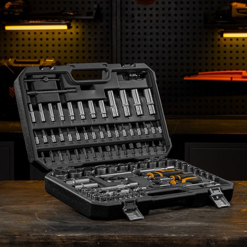 ключ-трещотка 1/2", 1/4" - 2 штвороток т-образный 1/4": 115 мм - 1 шткардан 1/2", 1/4" - 2 штудлинители 1/2": 125, 250 мм - 2 штудлинители 1/4": 50, 100 мм - 2 шт3-сторонний адаптер 3/8"-1/2" - 1 штпереходник для бит: 1/2"-5/16" - 1 штключи имбусовые - 3 штотвертка-держатель 2к-рукоятка 1/4": 150 мм - 1 штголовки торцевые свечные 1/2" - 2 штголовки торцевые 1/2" - 17 штголовки торцевые удлиненные 1/2" - 5 штголовки торцевые 1/4" - 13 штголовки торцевые удлиненные 1/4" - 8 штбиты-вставки 5/16", 30мм - 16 штбиты-вставки 1/4" - 11 штпластиковый кейс - 1 шт