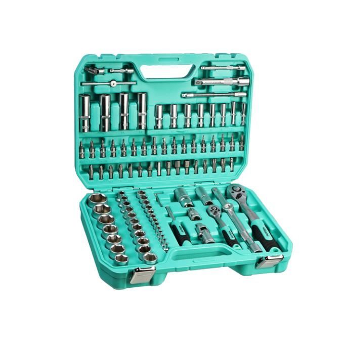 | Особенности | Хромованадиевая сталь обеспечивает долговечность инструмента, Адаптер для торцевых головок 1/4" в комплекте ускоряет работу в 10 раз, Эргономичная двухкомпонентная рукоятка обеспечивает комфортную работу с инструментом, Прочные и надежные металлические замки и петли кейса, Сталь 54-56 HRC гарантирует надежность даже при высоких нагрузках, Предметы в наборе изготовлены из хромованадиевой стали, обеспечивающей долговечность инструментов даже при усиленных нагрузках. Трещотка имеет механизм с 72 зубьями для плавного хода и комфортной работы в труднодоступны местах. Усиленный кейс с металлическими замками и петлями уверенно защитит ваши инструменты от внешних воздействий.. |