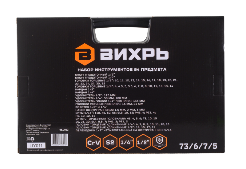 Набор инструментов Вихрь 94 предмета, 1/2", 1/4", CrV, пластиковый кейс,73/6/7/5