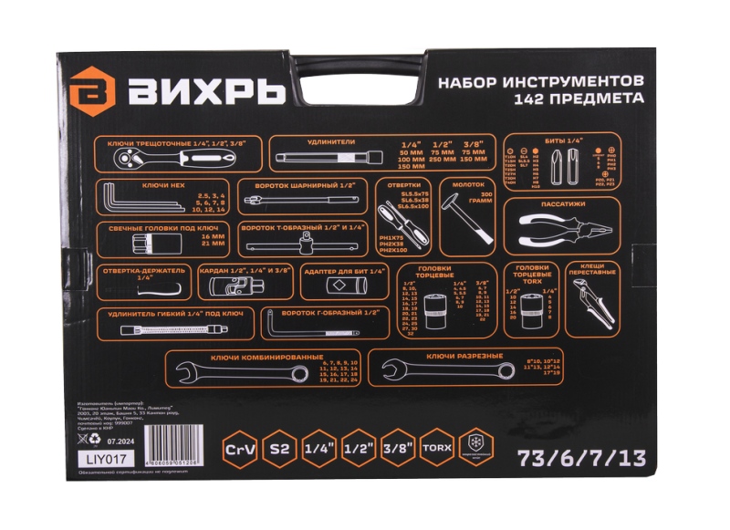 | Модель | Набор инструментов, 1/2", 1/4", CrV, в кейсе 142 предм |