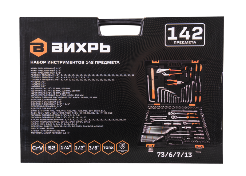 Набор инструментов, 1/2", 1/4", CrV, в кейсе 142 предм Вихрь, 73/6/7/13