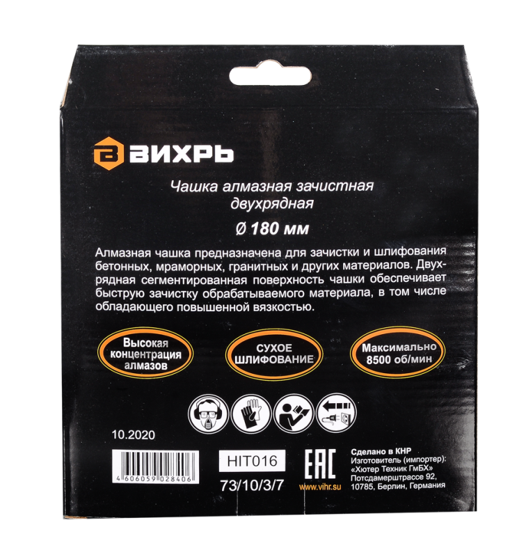 Чашка алмазная зачистная, 180 мм, двухрядная Вихрь, 73/10/3/7