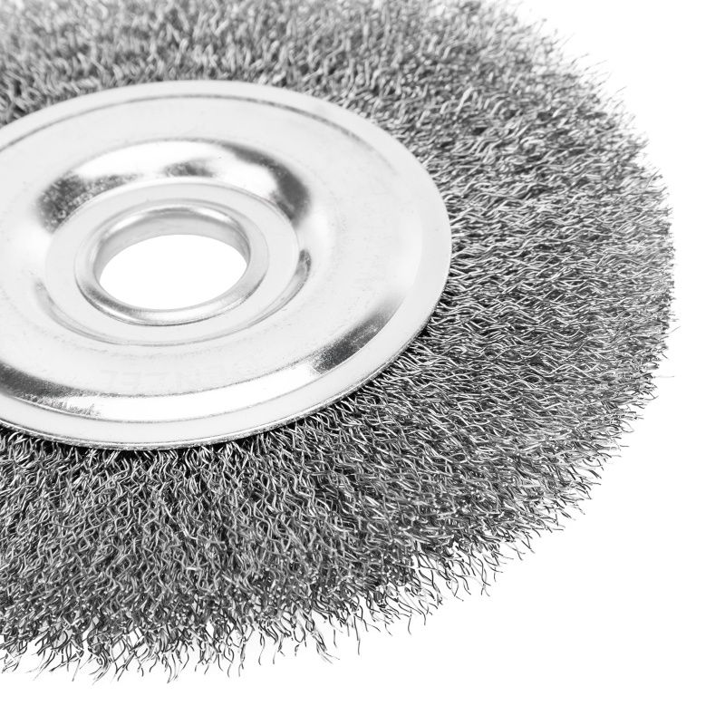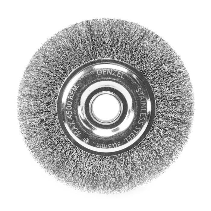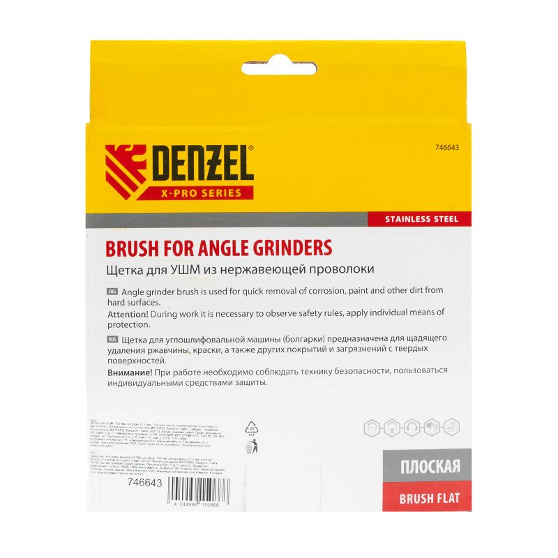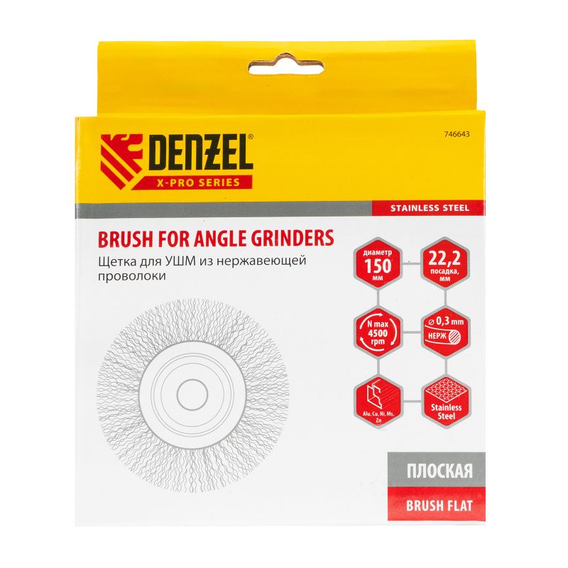 Щетка для УШМ, 150 мм, "Плоская", витая нержавеющая проволока 0.3 мм, посадка 22.2 мм Denzel, 746643