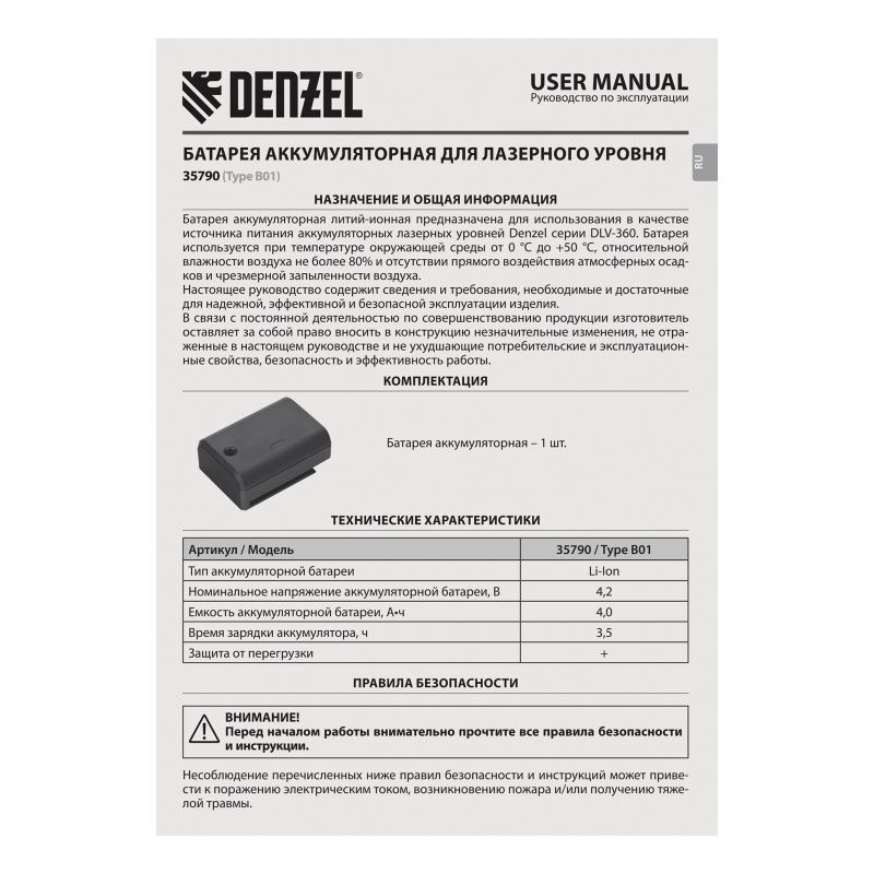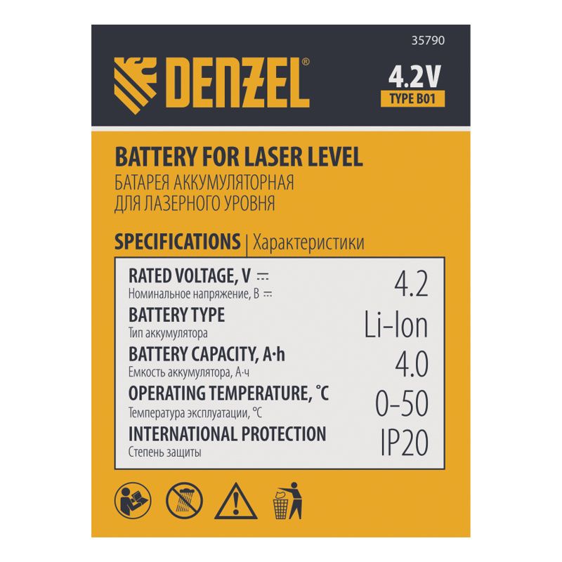 Батарея аккумуляторная для лазерного уровня Type B01, 4,2 В, 4000 мАч Denzel, 35790