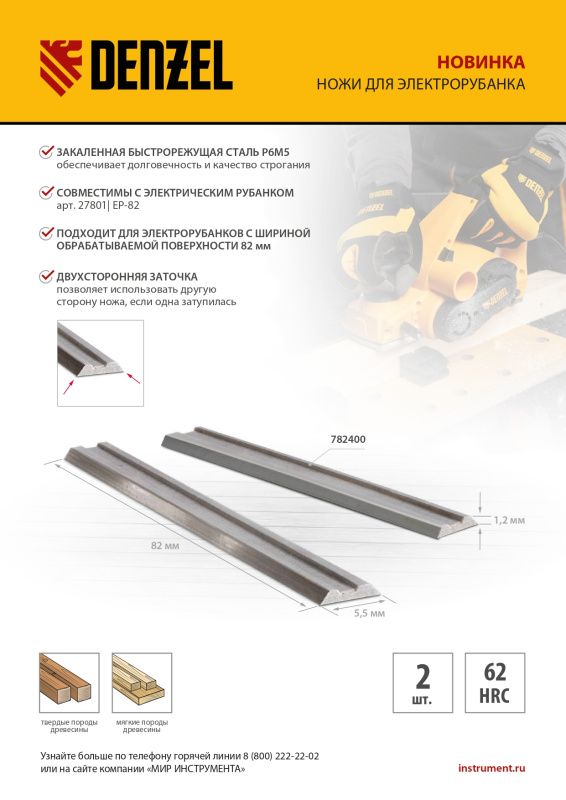Ножи для эл. рубанка, Р6М5, 82мм, 2шт Denzel, 782400