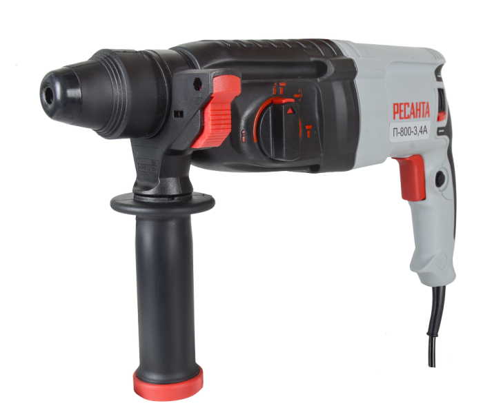 Перфоратор - электроинструмент, аналогичный дрели, но с наличием не механического, а пневматического ударного механизма. Именно поэтому перфоратор используют для сложных работ по твёрдым материалам - бетону, кирпичу, металлам. Агрегат используется для сверления и пробивания отверстий в прочных материалах без приложения особых физических усилий со стороны оператора. Принцип работы перфоратора – это разрушение обрабатываемого материала с помощью поступательных и вращательных действий рабочего элемента. Состоит перфоратор из электрического двигателя, редуктора, ударного механизма и патрона для крепления рабочих инструментов (буры, коронки, зубила и т.д.).Режимы подбираются исходя из типа работ, которые нужно проводить. Чем больше режимов в инструменте, тем он лучше справится с любым спектром работ:В режиме сверления перфоратор не отличается от обычной дрели и используется для сверления отверстий в различных материалах (дерево, металл).Сверление с ударом происходит при помощи вращательных и поступательных движений одновременно. Этот режим незаменим для сверления отверстий в твёрдых материалах (камень, бетон).Функция удара. В этом режиме инструмент работает подобно отбойному молотку, происходят только ударные движения. В этом режиме можно с лёгкостью рушить обрабатываемые поверхности из бетона и камня.Перфоратор П-800-3,4А имеет все три режима работы: сверление, сверление с ударом и функция удара. Предусмотрена система защиты рабочего механизма от попадания пыли.У перфораторов Ресанта горизонтальное расположение двигателя, которые расположены параллельно ударной оси. Преимущество горизонтальных моделей – удобство в эксплуатации. Горизонтальные перфораторы менее громоздки и позволяют проводить работы в труднодоступных местах.Преимущества:Прорезиненный ударопрочный корпусПерфоратор снабжён предохранительной муфтой, отключающей вращение инструмента при его заклиниванииНаличие нескольких режимов работыУстановленный патрон SDS-plus делает простым процесс смены расходного материалаНаличие регулируемого ограничителя глубины сверления.Система защиты рабочего механизма от попадания пылиБлокировка кнопки включенияЭлектронная регулировка оборотов