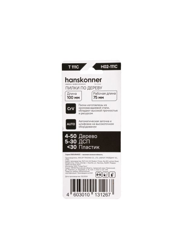 | Длина лезвий, мм | Пилки для лобзика по дереву 2шт, T111C (мяг,тверд 5-50мм) Hanskonner |